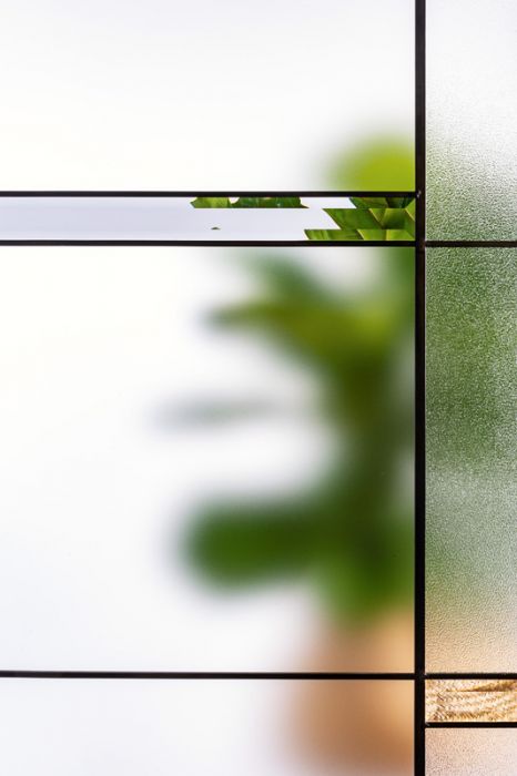 Belmont is a Stained Glass model with an urban look designed for today's architectural styles. Its minimalist, asymmetrical composition of flat black patina caming and satin finish glass fits perfectly with the volumes and materials found in the architecture of contemporary houses. Paired with a satin black handle, Belmont's elegance is unrivaled.