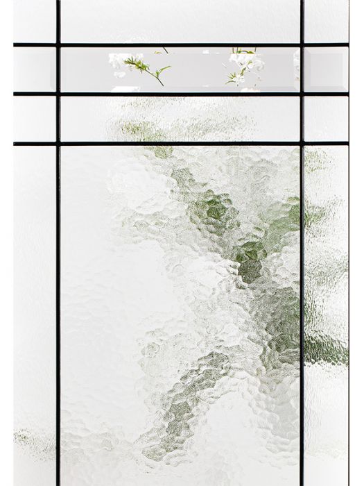 Celeste juxtaposes different types of glass within its patina caming, creating a delicate geometric pattern with a refined and balanced light effect.