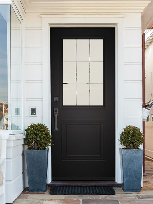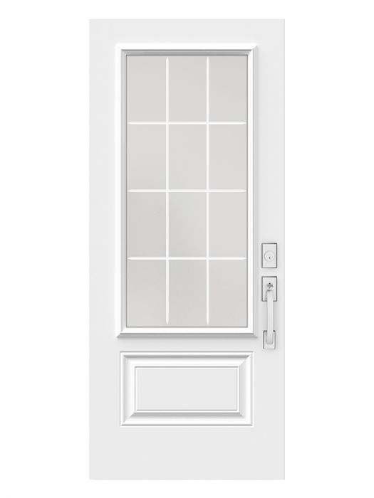 The Distinction V-Groove model is perfect for matching your doorglass to your grilled home windows. The polished V-Groove lines add a touch of brightness to the sandblasted glass creating a bright yet private entrance to your home.