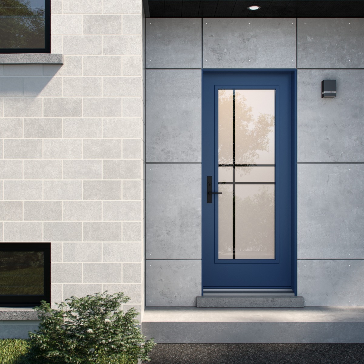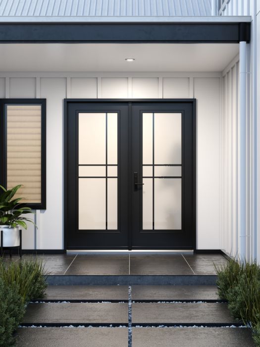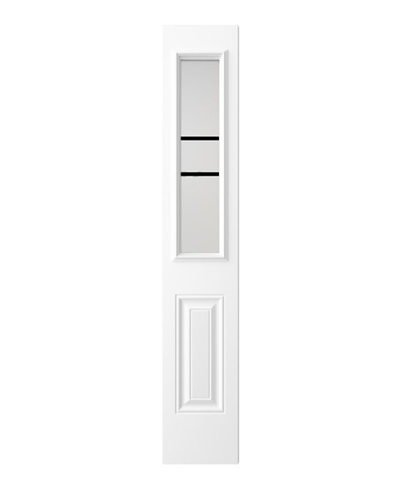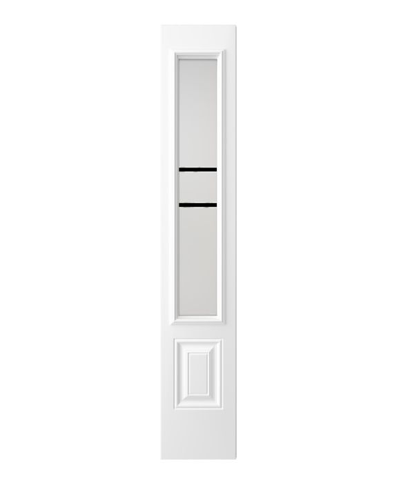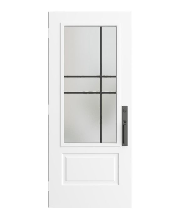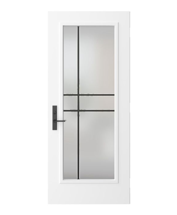The Equation model offers the simplicity and privacy of sandblasted finish glass, crossed with black perpendicular lines. Evoking window grids and divisions in a more modern style, Equation is the perfect match for Contemporary or Farmhouse style homes. Thin, clear lines allow a view to the outside. Available in left or right versions.