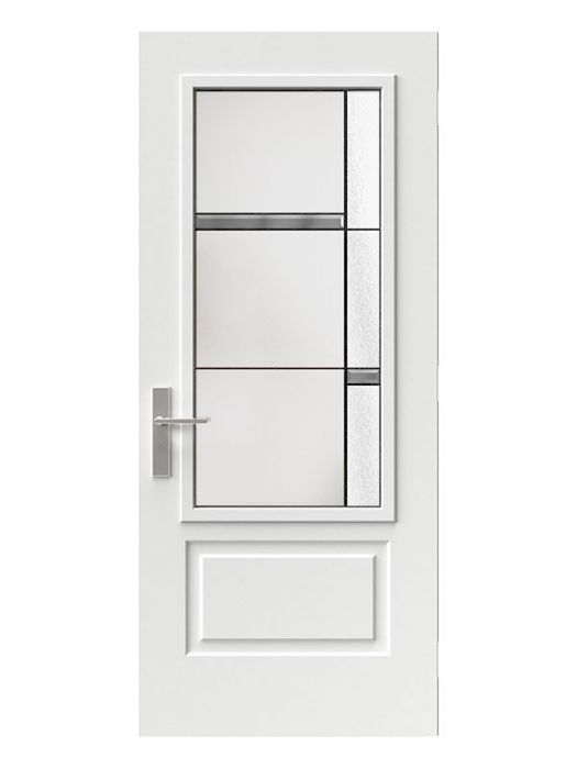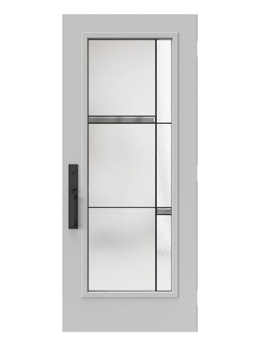 Belmont is a Stained Glass model with an urban look designed for today's architectural styles. Its minimalist, asymmetrical composition of flat black patina caming and satin finish glass fits perfectly with the volumes and materials found in the architecture of contemporary houses. Paired with a satin black handle, Belmont's elegance is unrivaled.