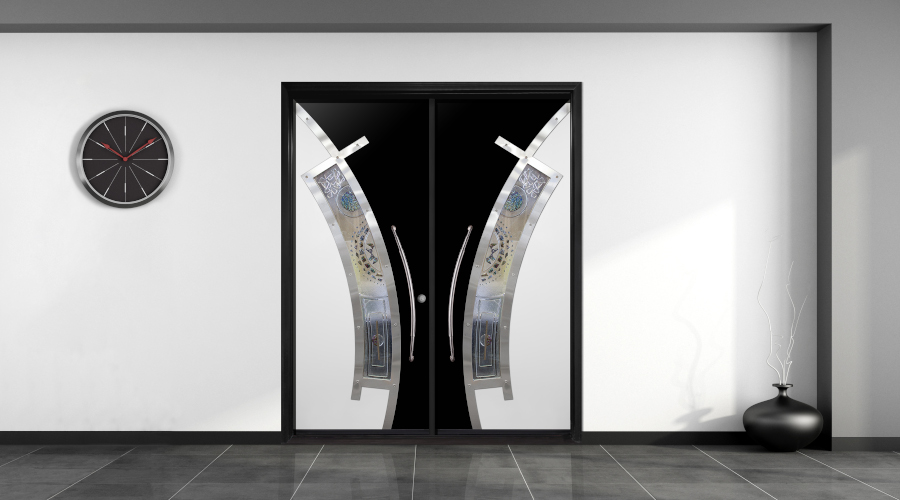 Avenue Series – doors with design and texture formed by glass inserts and decorative stainless steel frames.