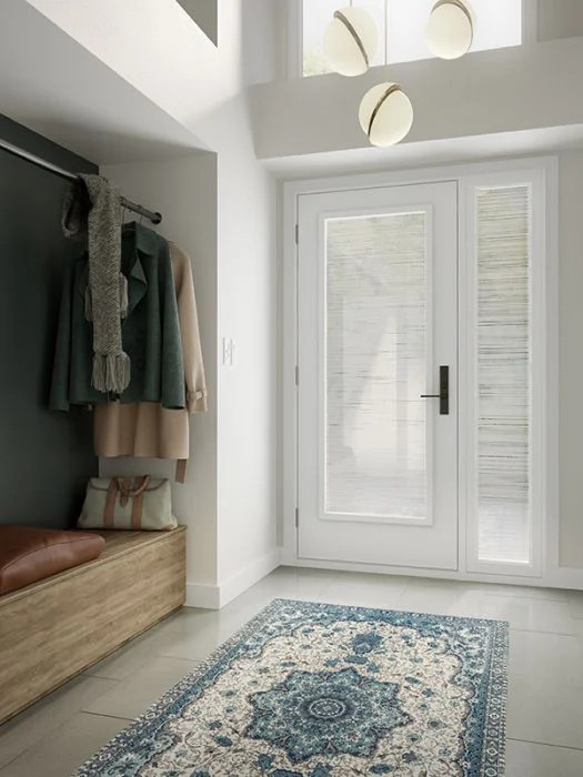 Kira delicately filters light and fills your entrance with a sense of calm. Two layers of fine, sandblasted finish lines overlap to create a natural looking pattern that provides a good degree of privacy.