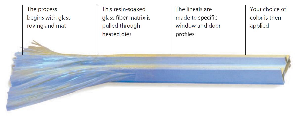 Pultruded fiberglass is an engineered material that is created through a process where strands of glass and glass matting are pulled through a heated die. The glass is bonded together with a matrix of "heat setting" resins as it passes through the die at extremely high temperatures. The resulting lineals (customized to specific window component requirements) are cut to length.